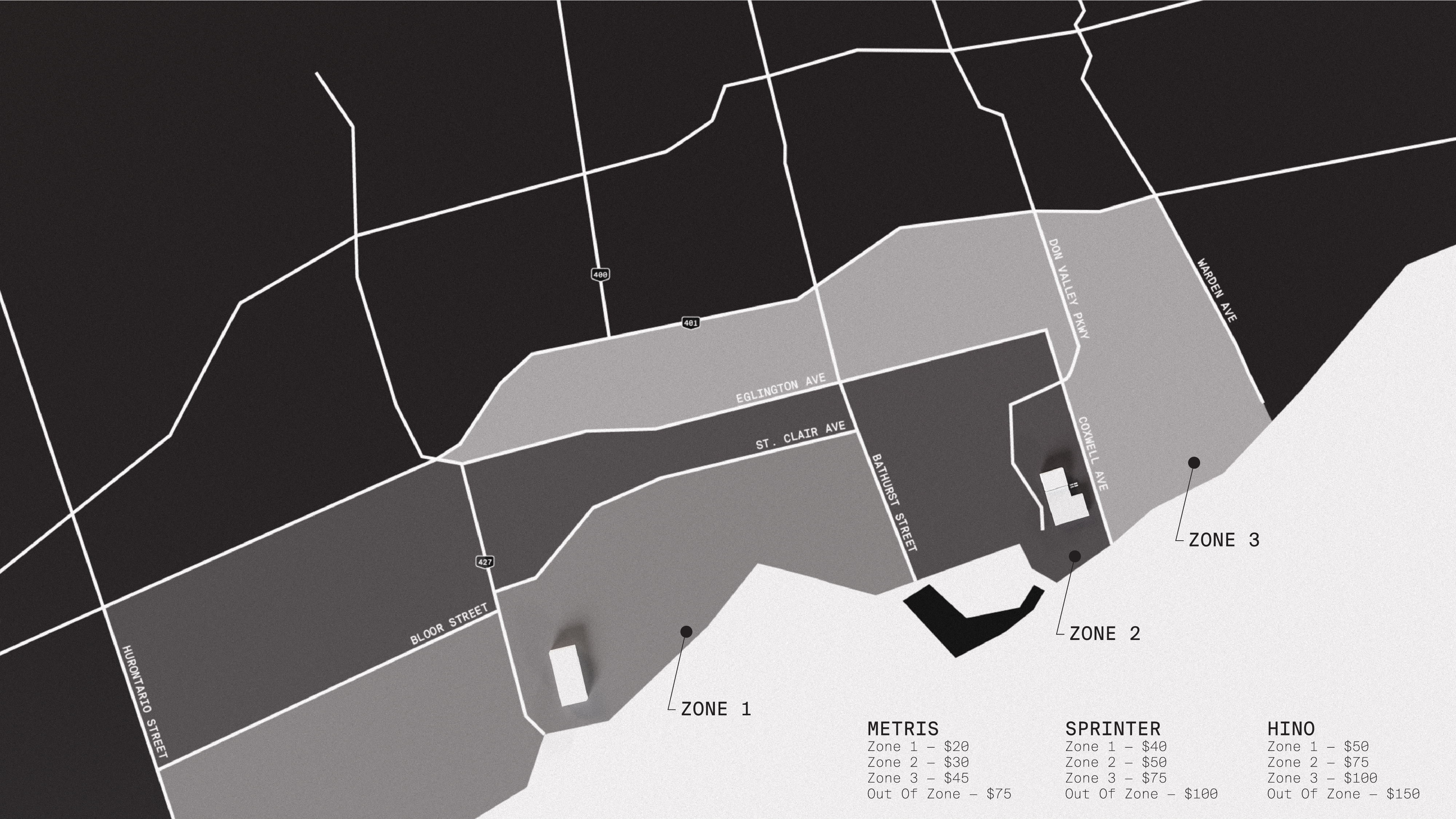 We cover the Greater Toronto Area across three delivery zones. Locations outside these zones are available by quotation.
